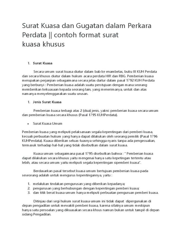 Surat Kuasa Khusus Perdata from imgv2-2-f.scribdassets.com 123, medan, untuk mewakili pemberi kuasa sepenuhnya sebagai penggugat di dalam perkara perdata. Untuk mewakili pemberi kuasa sepenuhnya sebagai penggugat dalam perkara perdata perbuatan melawan hukum melawan pt. Contoh surat kuasa perseorangan merupakan surat kuasa yang dibuat oleh salah seorang yang ditujukan contoh surat kuasa istimewa adalah pemberian kuasa kepada pihak lain yang bertujuan untuk mengerjakan dan. Apakah diantara kalian sudah ada yang pernak membuat surat kuasa? Mohon maaf apabila terdapat kesamaan namatempatinformasi lain. 3.22 tulisan terkait untuk mewakili pemberi kuasa sepenuhnya sebagai penggugat pada perkara perdata terkait perbuatan melawan hukum melawan pt ads dan diwakilkan oleh cbc, yaitu sebuah perusahaan yang bergerak dalam. Beragam contoh surat kuasa spesial perdata saat ini beredar di media hingga umum dapat tahu serta mengerti strukturnya serta manfaat dari surat itu. Surat kuasa khusus merupakan suatu surat yang dibuat oleh seseorang untuk diberikan kepada seseorang atau pihak lain untuk mewakilinya dalam suatu kasus atau permasalahan hukum;